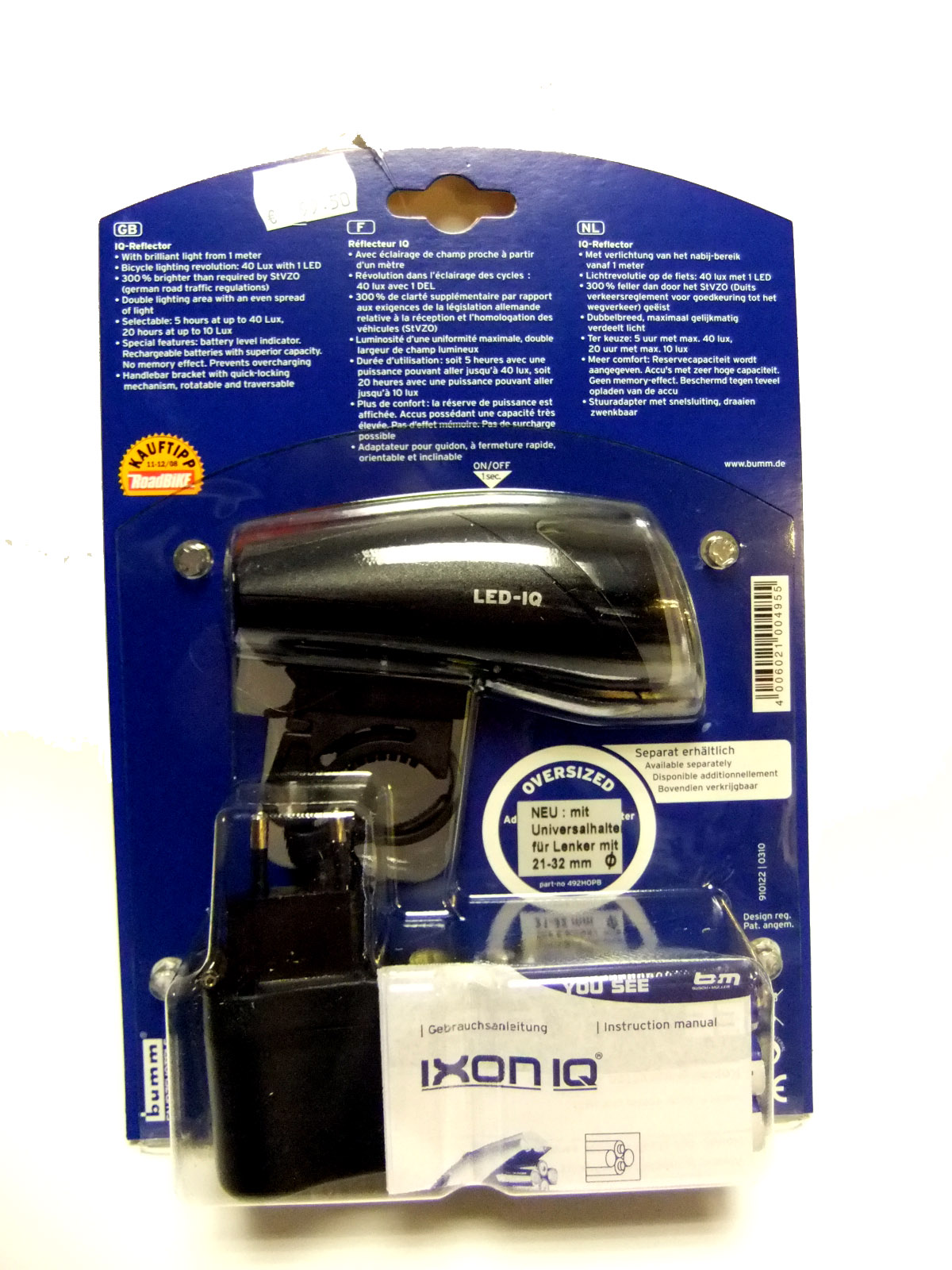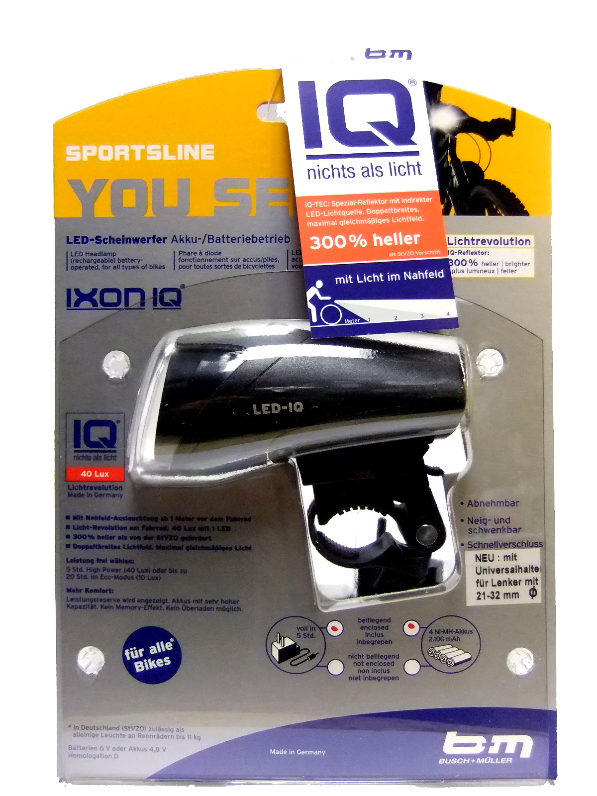 Akku-Beleuchtungs-Set, abnehmbar: "busch&müller" IXON-IQ, schwarz: LED-Frontstrahler mit bis zu 40Lux und 20 Stunden Leuchtdauer, incl. Rücklicht, Akkus, Ladegerät und Befestigungselemente; StVO-zugelassen, neu: mit universeller Lenkerklemmung auch für 21-32mm (Oversize)