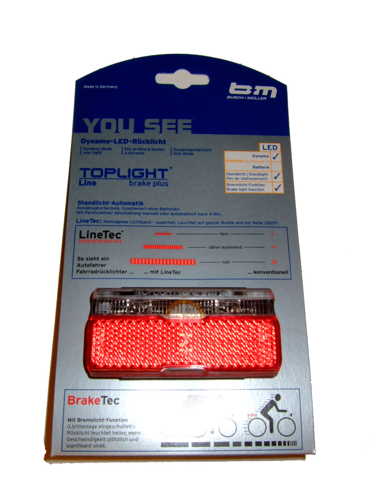 Bremsrücklicht b&m TOPLIGHT Line brake plus, LED-Rückstrahler incl. Bremslichtfunktion und Standlichtautomatik; Gepäckträgermontage. (Bohrungsabstand 80mm)