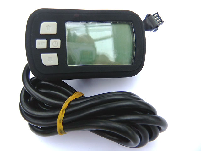 Pedelec Display / Bedien-Panel 36V. Zur Einstellung von 5 Geschwindigkeitsstufen sowie Raddurchmesser und Max.-Geschwindigkeit. Mit den üblichen Fahrradcomputer-Funktionen wie Anzeige von Geschwindigkeit, Zeit, Fahrstrecke, etc. Beleuchtetes Display. 4-polig.