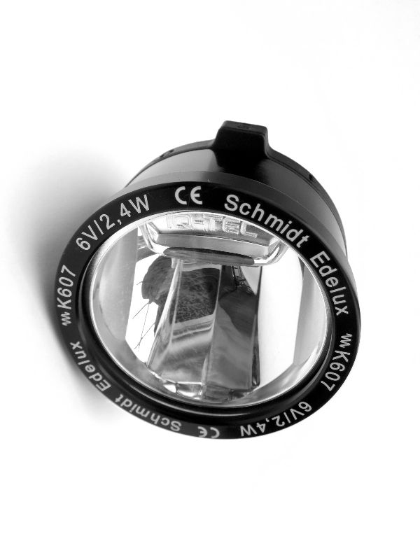 SON Edelux LED Scheinwerfer von Fa. Schmidt aus Tübingen, das Original zum SON Nabendynamo mit bis zu 70 LUX, inclusive Einschalt- und Standlichtautomatik: Mehr Licht, Komfort & Stil geht nicht. Schwarz eloxiert.