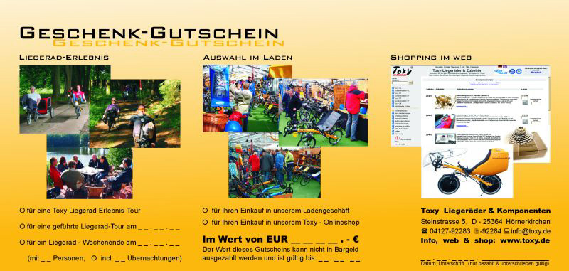 Für jeden Anlass das passende Geschenk für Liegerad-Freunde und alle, die es noch zu begeistern gilt: Verschenken Sie einfach einen Einkaufsbummel in unserem Toxy Online-Shop oder ein Liegerad-Erlebnis-Wochenende…