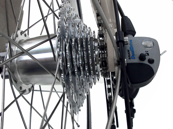 Komplettrad Toxy-TT, vollgefedert, Serienausstattung SRAM DualDrive / Shimano XT 27Gg., incl. hydraulische Scheibenbremsen Magura MT, Schalensitz "Race", einstellbares Luftfeder-Element; Rahmenfarbe silber metallic