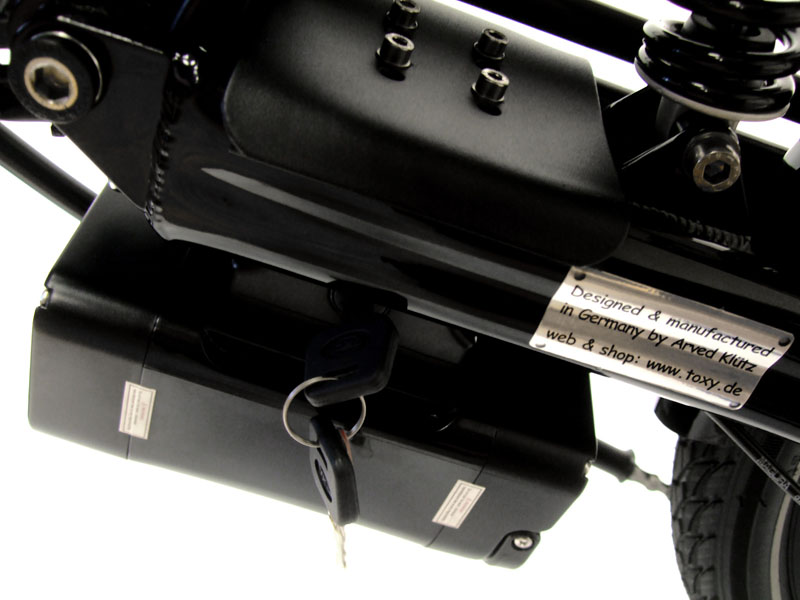 Komplettrad Toxy-TT, vollgefedert, Serienausstattung; Pedelec mit sehr leisem 250W HR-Antrieb, incl. 36V/10,4Ah LiIon Akku & Ladegerät. Akku abnehmbar & abschließbar. Schaltung Deore 9-fach. Zulassungs- und führerscheinfrei. – Einfach noch entspannter Toxyfahren! Incl. hydraulische Scheibenbremsen Magura "MT4", Schalensitz "Race", einstellbares Luftfeder-Element; Rahmenfarbe silber metallic.